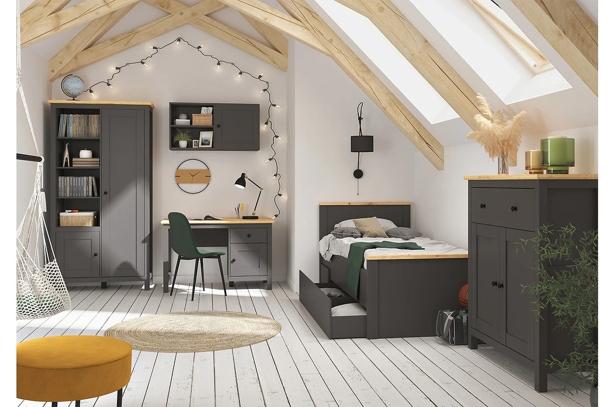 Meble wykonane są z trwałych materiałów odpornych na codzienne użytkowanie, co zapewnia im długowieczność i łatwość w pielęgnacji.
