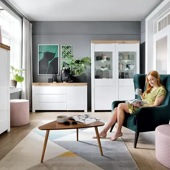 System mebli Holten od Black Red White to propozycja dla osób ceniących nowoczesny design z nutą przytulności. Biel w wysokim połysku połączona z ciepłym dekorem dębu wotan tworzy harmonijną całość, która rozjaśnia wnętrze i nadaje mu lekkości. Dzięki dużemu wyborowi elementów, kolekcja Holten pozwala na kompleksowe urządzenie salonu, sypialni, jadalni, a także przedpokoju.