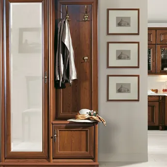 Klasyczne wzornictwo – stylowe frezy, ozdobne listwy i dekoracyjne uchwyty podkreślają elegancki charakter mebli.