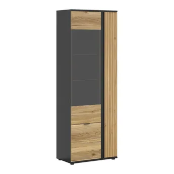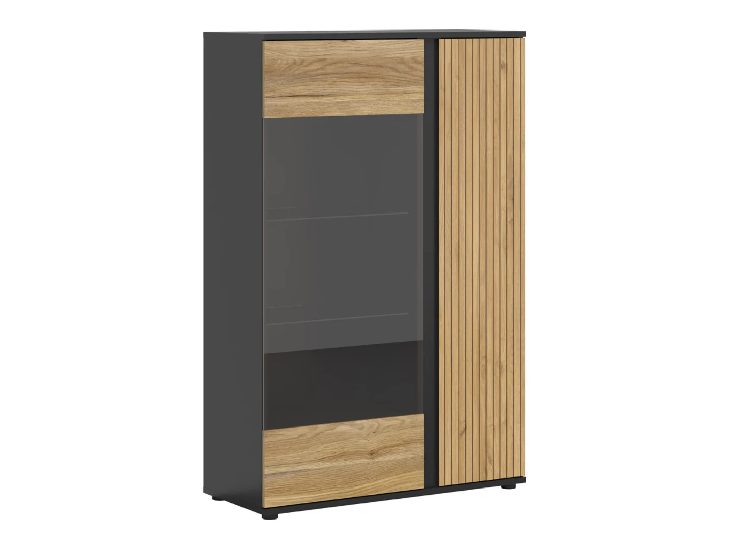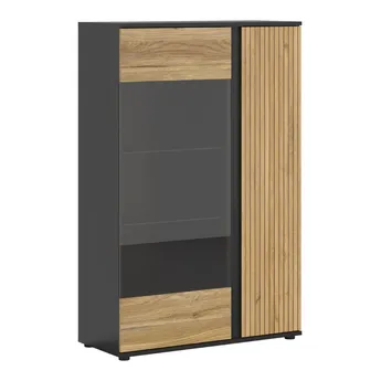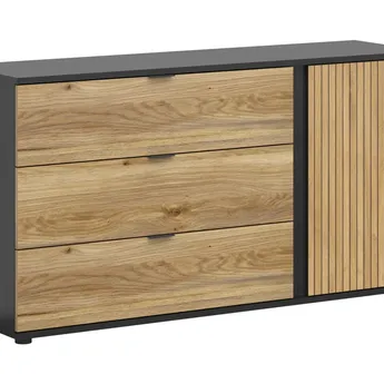 Harmonijne połączenie gładkich frontów z nadrukowanymi lamelami na drzwiczkach to cechy, które nadają meblowi charakterystyczny akcent.