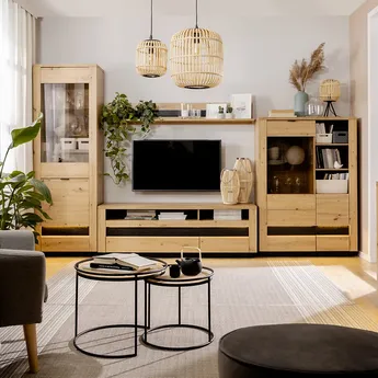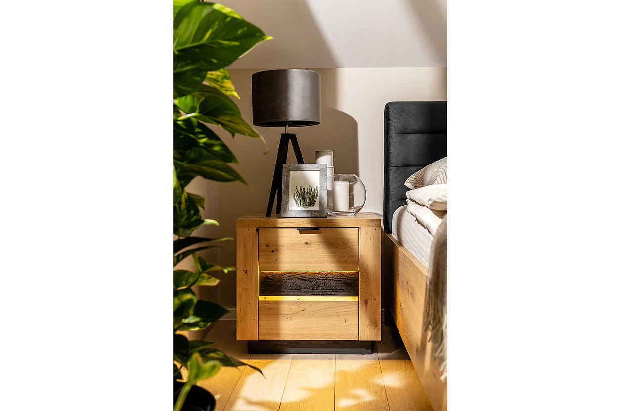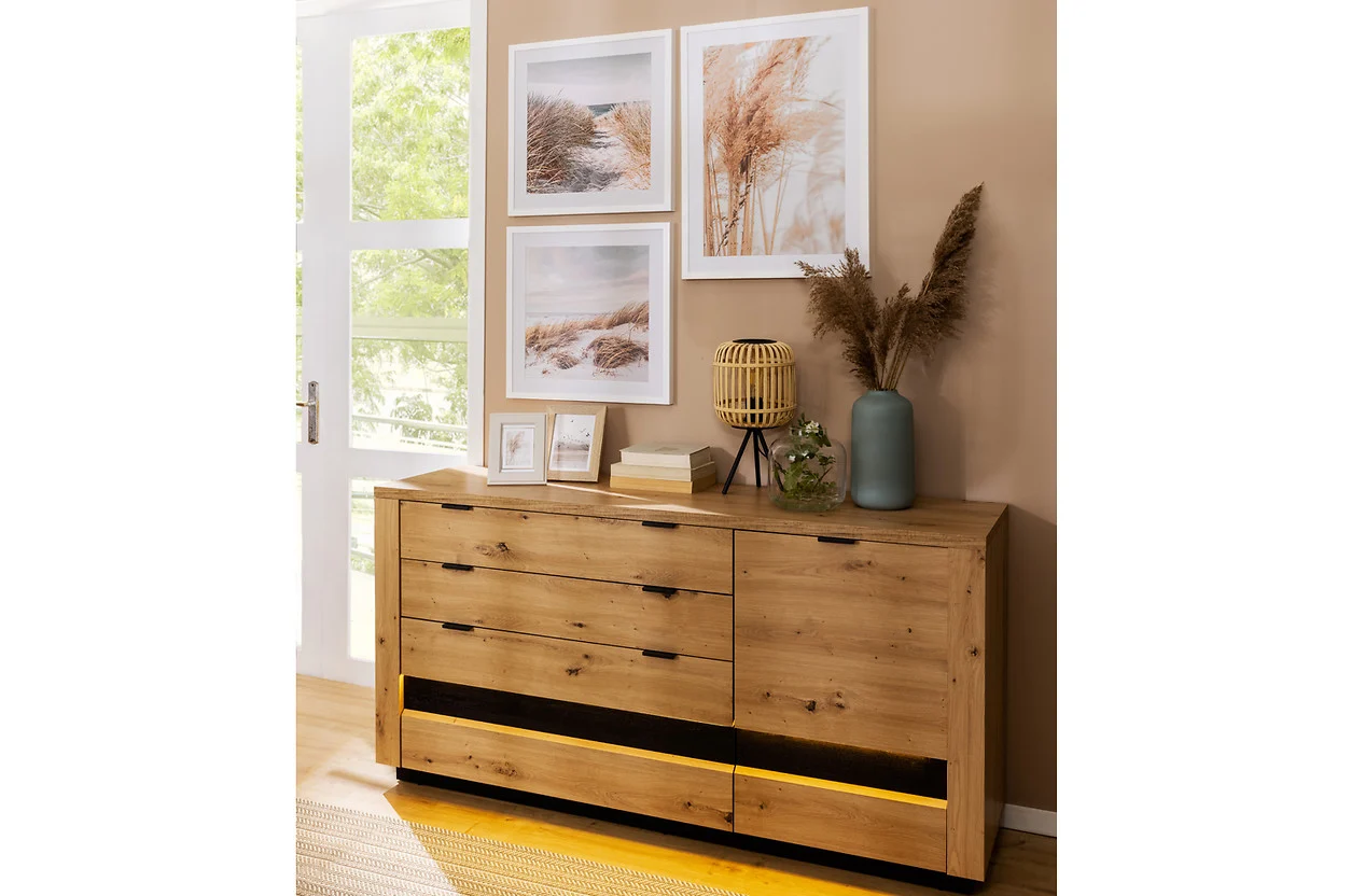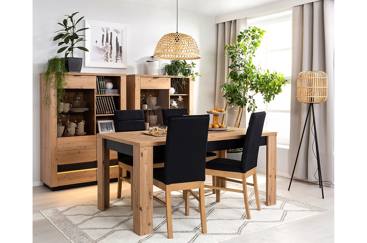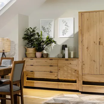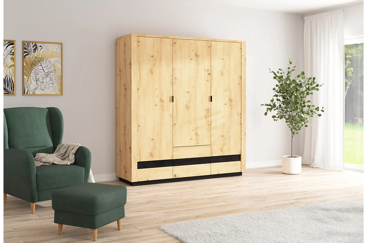 Nowoczesny styl – minimalistyczne bryły, poziome frezowania i kontrastowe zestawienie kolorów (np. dąb artisan z czernią) tworzą elegancką całość.